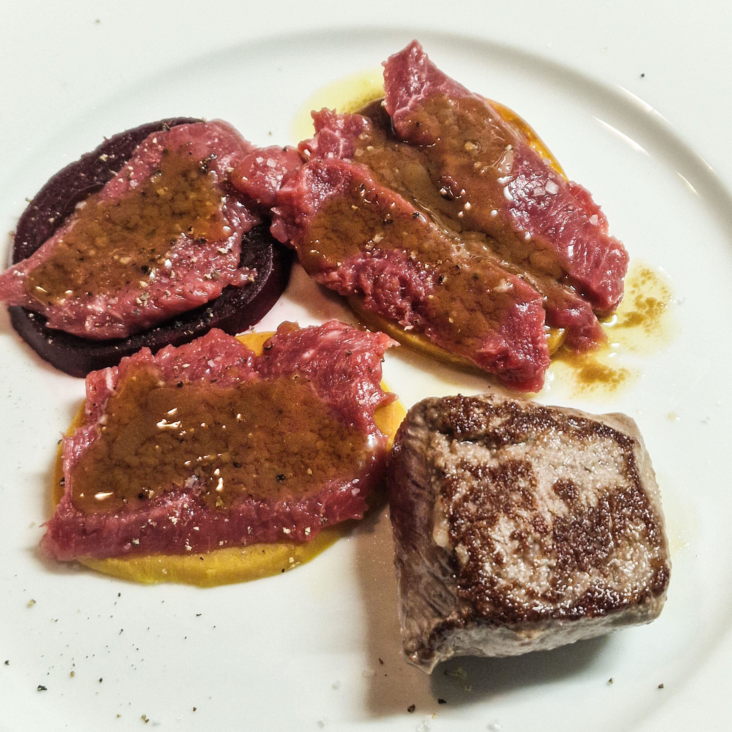 Lammcarpaccio auf gelber und roter Bete